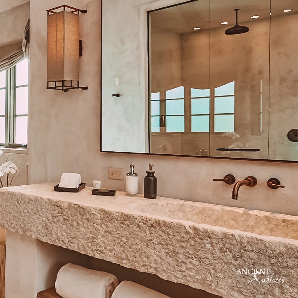 Ancient Surfaces created a vision of a bathroom as a place to cleanse the soul, where modernity met history. The ancient limestone was sculpted into a masterpiece, creating a tub reminiscent of Roman baths and a sink standing as a testament to craftsmanship.