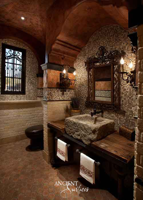 In the second vision, the rugged allure of a limestone trough rests atop a wooden ledge, evoking a Mediterranean essence that is both rustic and refined. The limestone sink by Ancient Surfaces sits in harmony with the earth-toned mosaics and terracotta hues, a composition that feels like a secluded retreat within the bounds of one’s abode. This setting is not just a space; it’s a transportive experience, reminiscent of a Tuscan villa bathed in the golden hour’s glow.