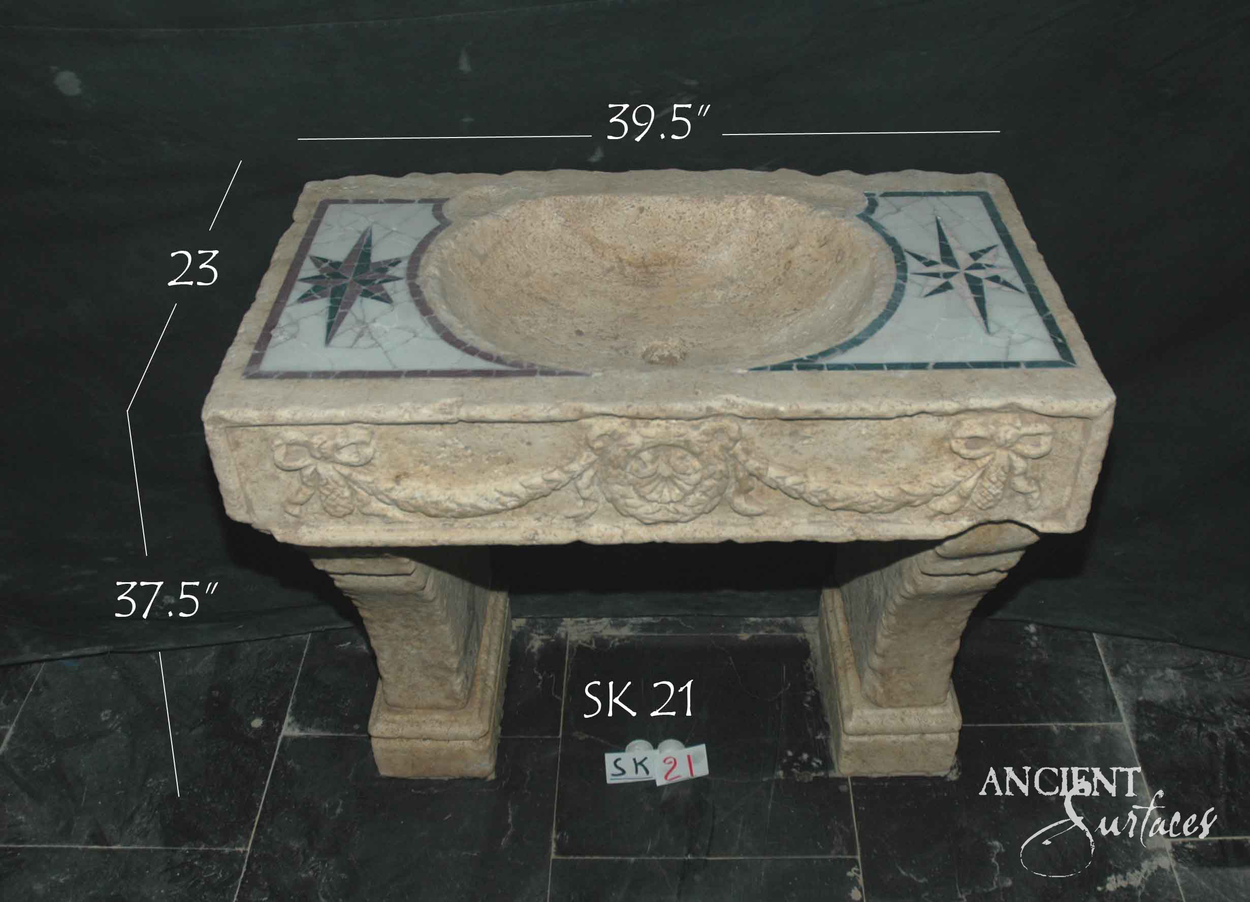 Transport yourself to the age of exploration, where the stars were guides for sailors and adventurers. The limestone sink with star-like mosaic inlays speaks of dreams of distant lands and the excitement of uncharted territories. Envision this sink in the home of a merchant or sailor, its stars a constant reminder of journeys undertaken and horizons yet to be discovered. Its intricate design and storied past add a touch of adventure and wanderlust to your space.
