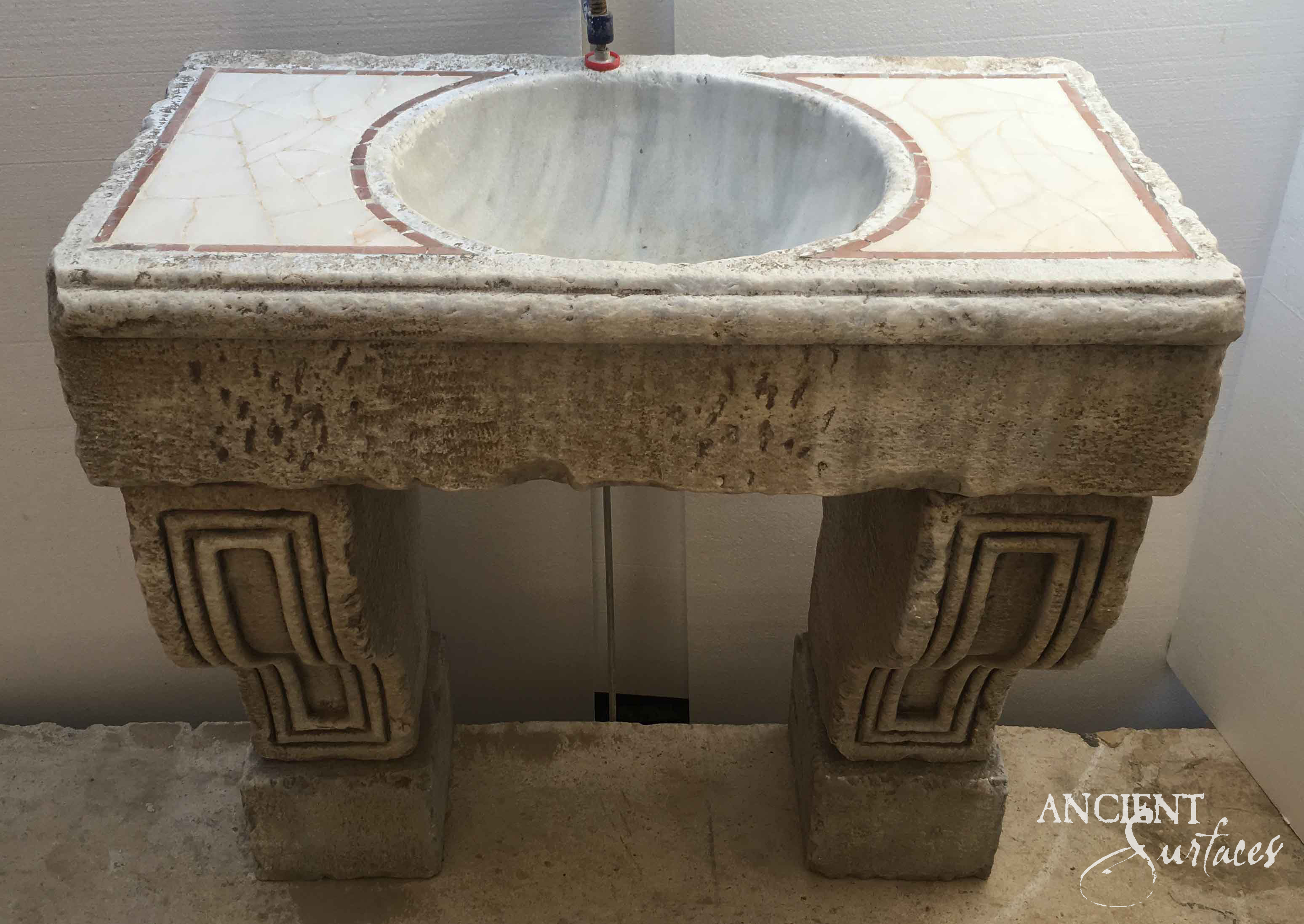 The following sink is a visual masterpiece that merges limestone with marble. Its striking marble basin, encircled by subtle mosaic detailing, exudes sophistication. Supported by robust carved legs of pure limestone, this sink combines texture and pattern to craft a luxurious yet refined look. Ideal for those seeking a distinctive touch in their bathroom, it emphasizes the perfect balance between artful detailing and enduring craftsmanship.