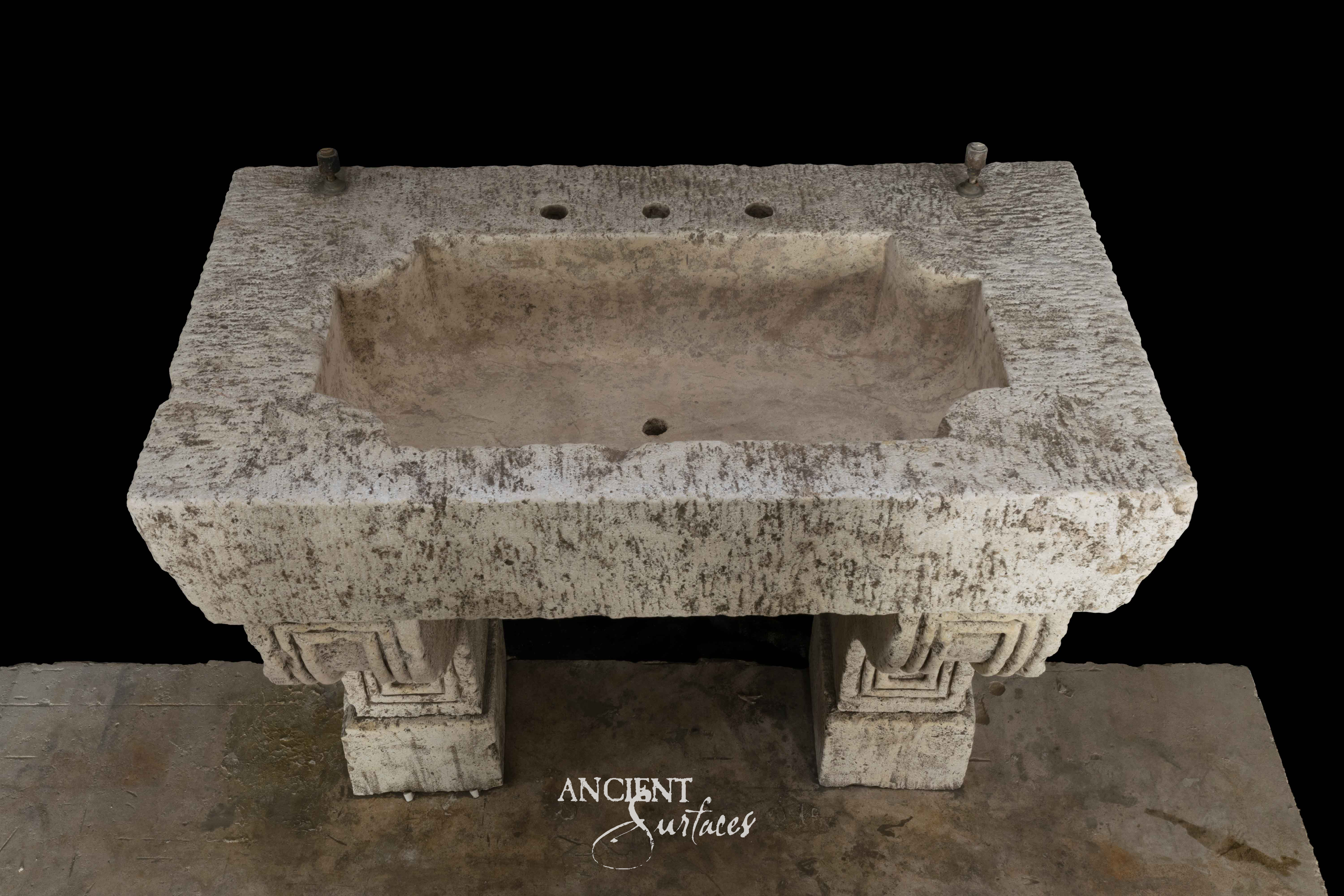 You’re not just looking at a basin, you’re staring at centuries of artisan tradition, hand-carved from reclaimed limestone with a presence so noble, it could belong in a Renaissance villa. Every chiselled curve, every weathered edge, whispers of a time when craftsmanship was sacred. The squared legs are sculpted like classical columns, making this piece not just a sink, but a centerpiece of legacy and luxury.