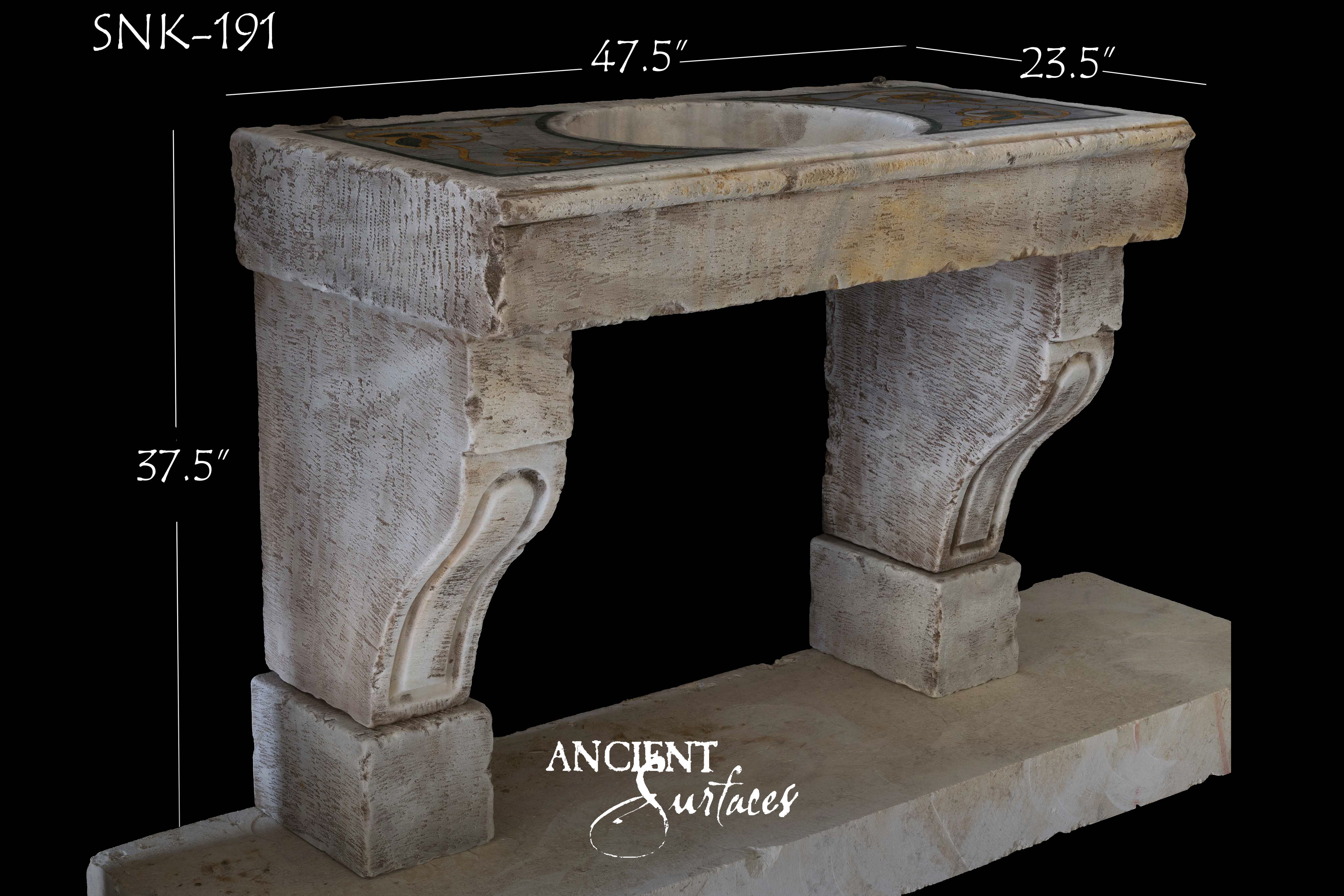 SNK-127 showcases bold architectural lines paired with intricate detailing etched into its supporting legs. The carvings on its structure suggest artisanal craftsmanship, with each curve and angle adding visual depth. Ideal for an Old-World-inspired bathroom or a Tuscan-style courtyard, this limestone sink is a statement piece that draws the eye while serving its practical purpose. Ancient Surfaces’ dedication to quality is evident in every inch of this masterpiece.
