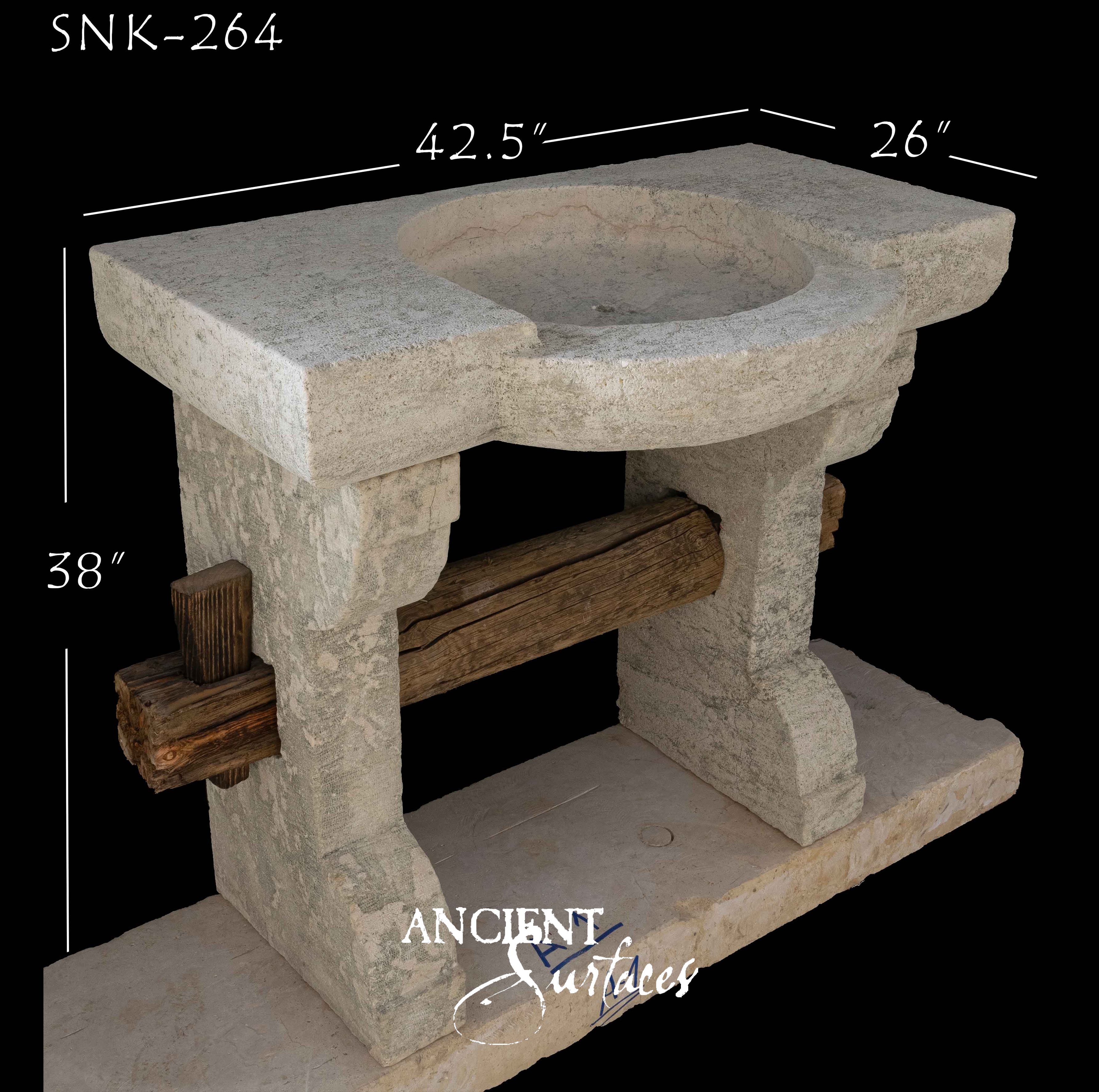 The SNK-264 sink presents a rustic charm with its robust construction and unique wooden crossbeam. Its raw limestone texture carries an earthy aesthetic, ideal for spaces that embrace natural materials and organic designs. This sink would be perfectly suited for a countryside estate or a heritage-inspired home, adding a layer of history to functional spaces. Ancient Surfaces ensures the integrity of every detail, preserving its timeless appeal.