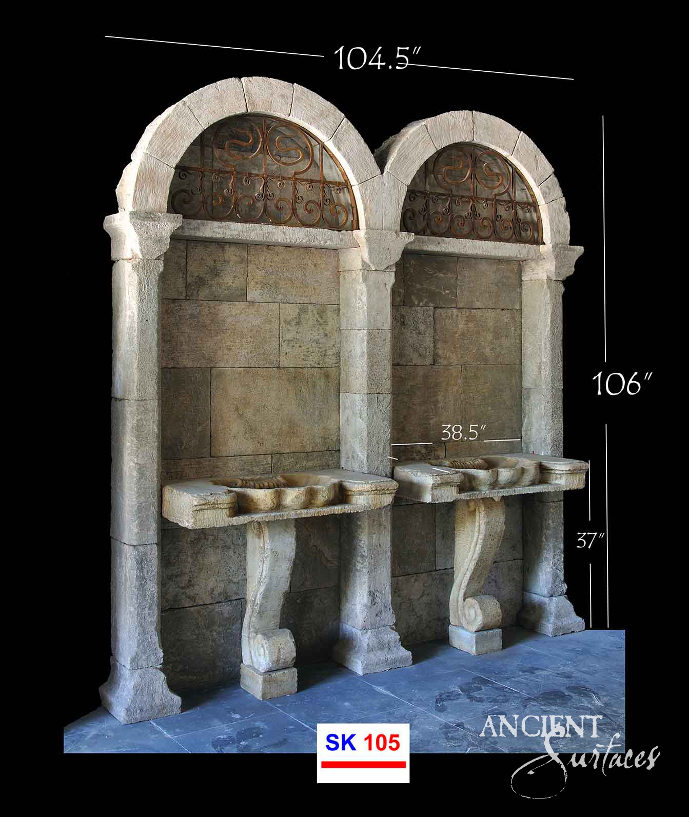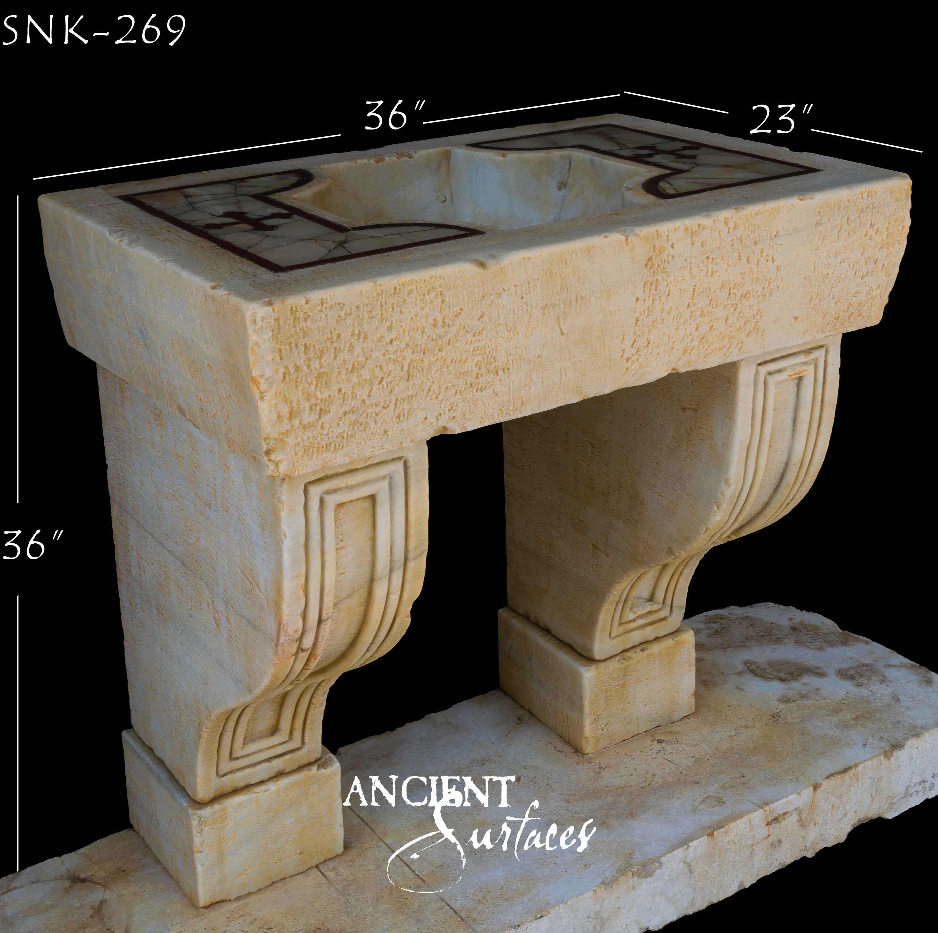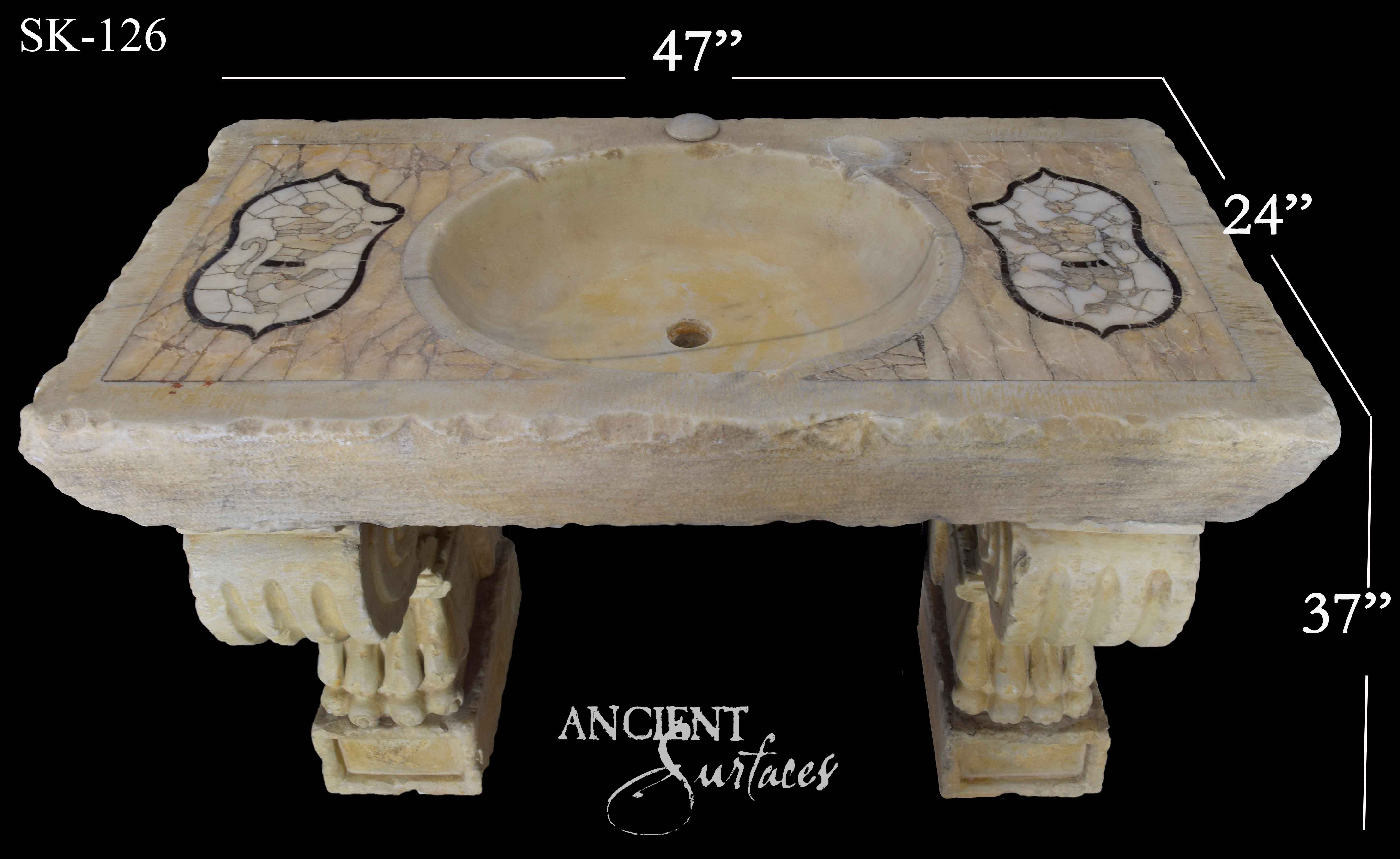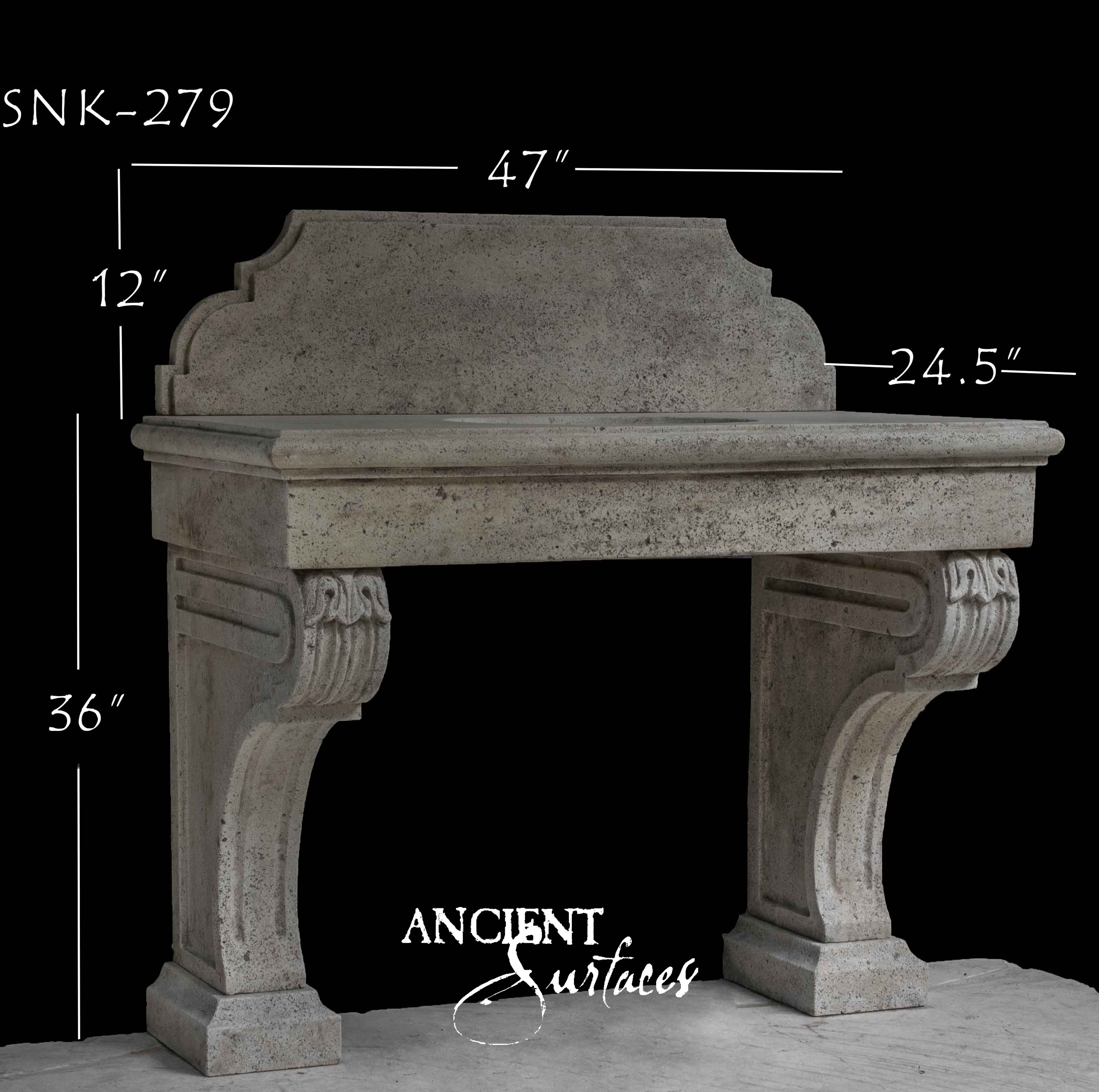 SNK-127 showcases bold architectural lines paired with intricate detailing etched into its supporting legs. The carvings on its structure suggest artisanal craftsmanship, with each curve and angle adding visual depth. Ideal for an Old-World-inspired bathroom or a Tuscan-style courtyard, this limestone sink is a statement piece that draws the eye while serving its practical purpose. Ancient Surfaces’ dedication to quality is evident in every inch of this masterpiece.