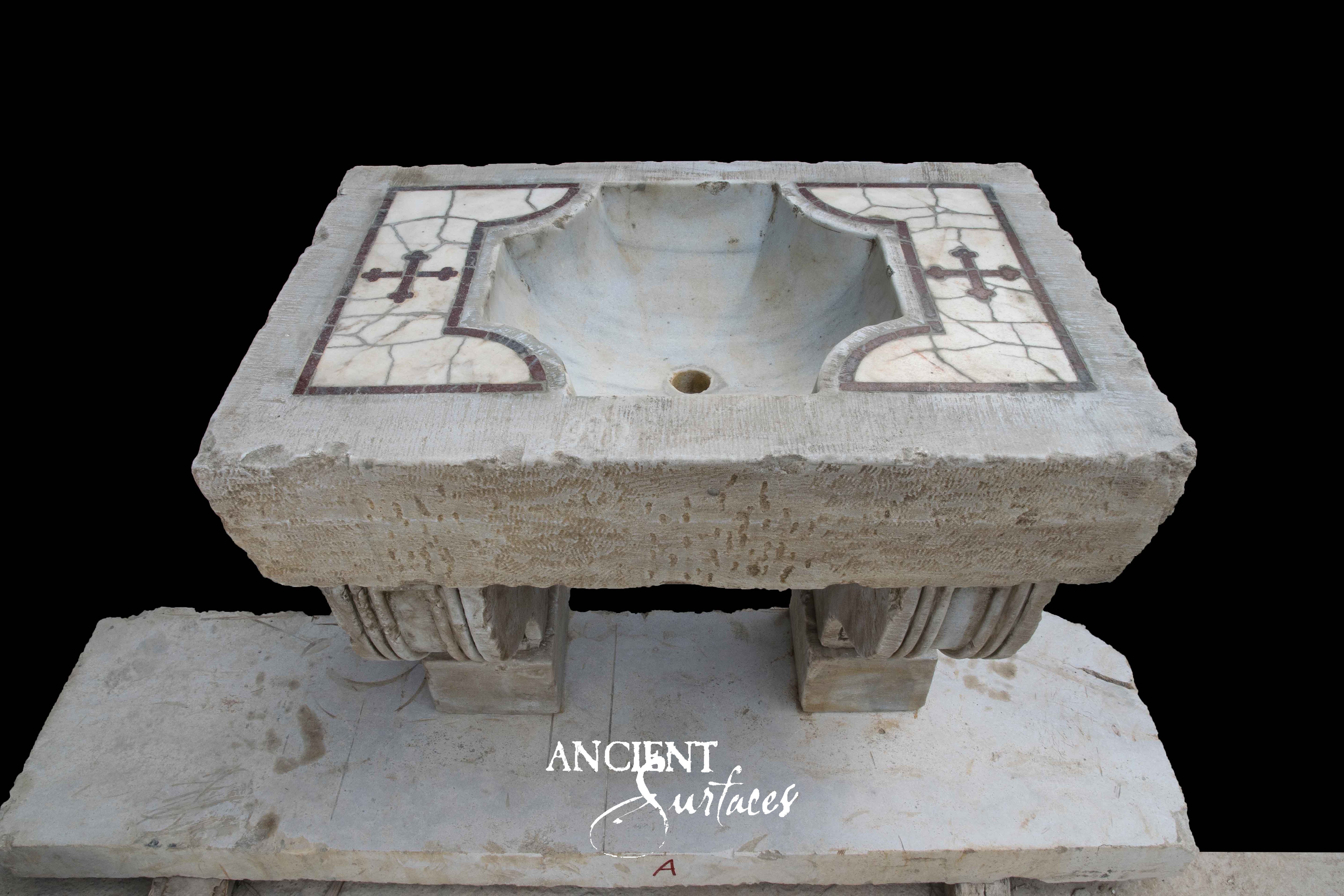 The SNK-232 sink embodies refined symmetry and understated elegance. With three circular carvings adorning its facade, each featuring a cross-inspired motif, this antique limestone sink captures a sense of balance and harmony. Its sturdy yet graceful legs provide structural support while adding to the sink’s aesthetic appeal. Perfect for a Mediterranean-inspired villa or a rustic kitchen, this sink from Ancient Surfaces elevates utility into timeless beauty.